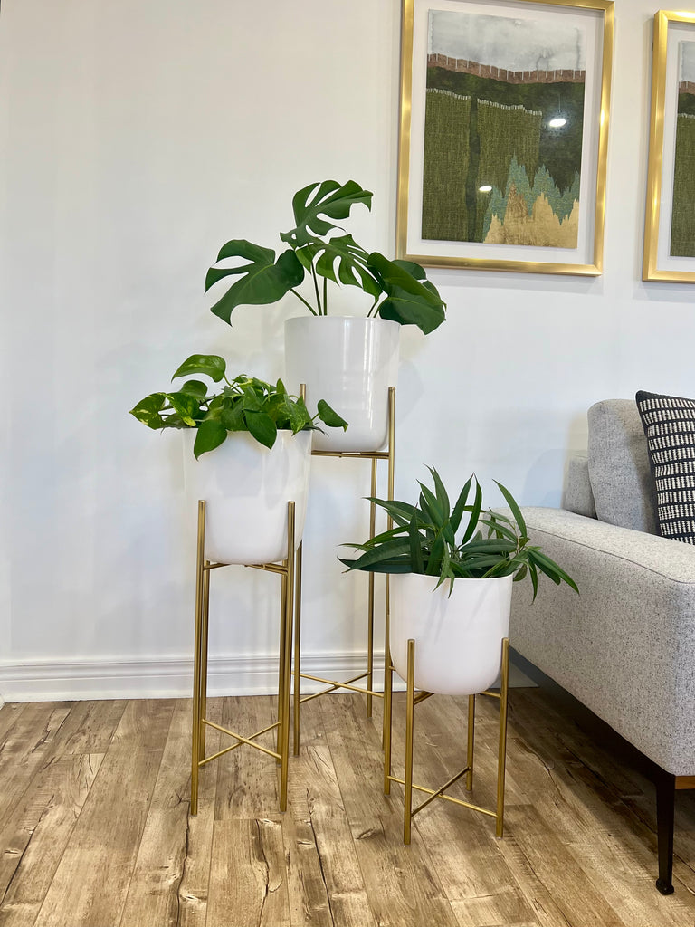 Charcoal Metal Planter Pots on Gold Plant Stands