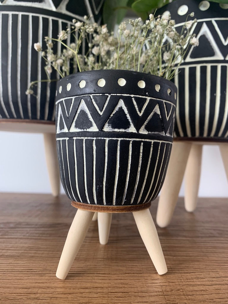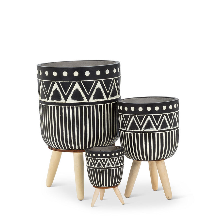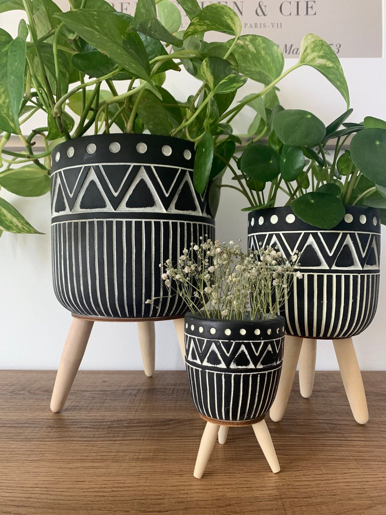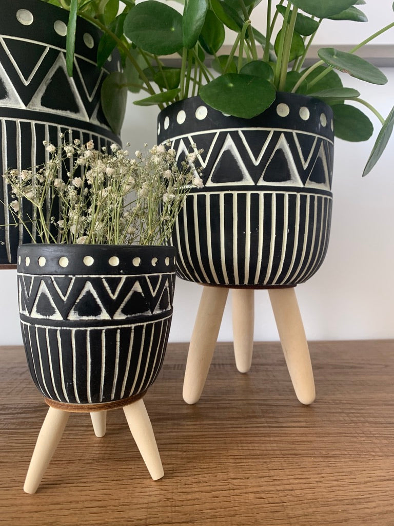 These patterned tripods are a perfect way to bring design and structure to your space. The cement pots sit on three sturdy wood legs. A favorite for boho lovers.