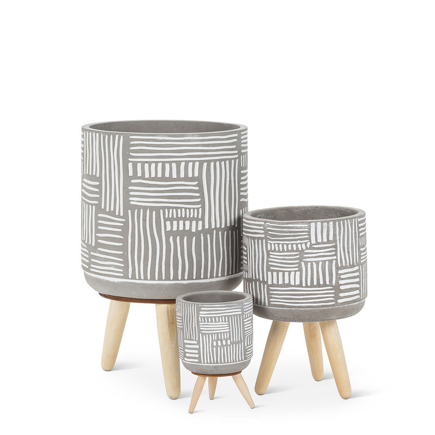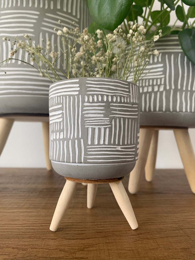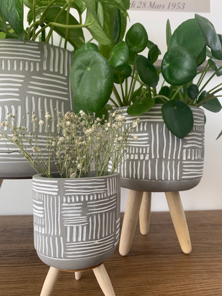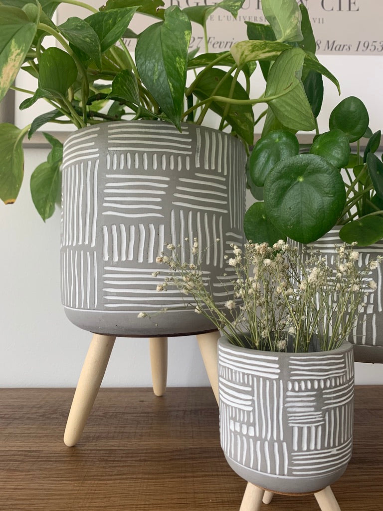These patterned tripods are a perfect way to bring design and structure to your space. The cement pots sit on three sturdy wood legs. A favorite for boho lovers.