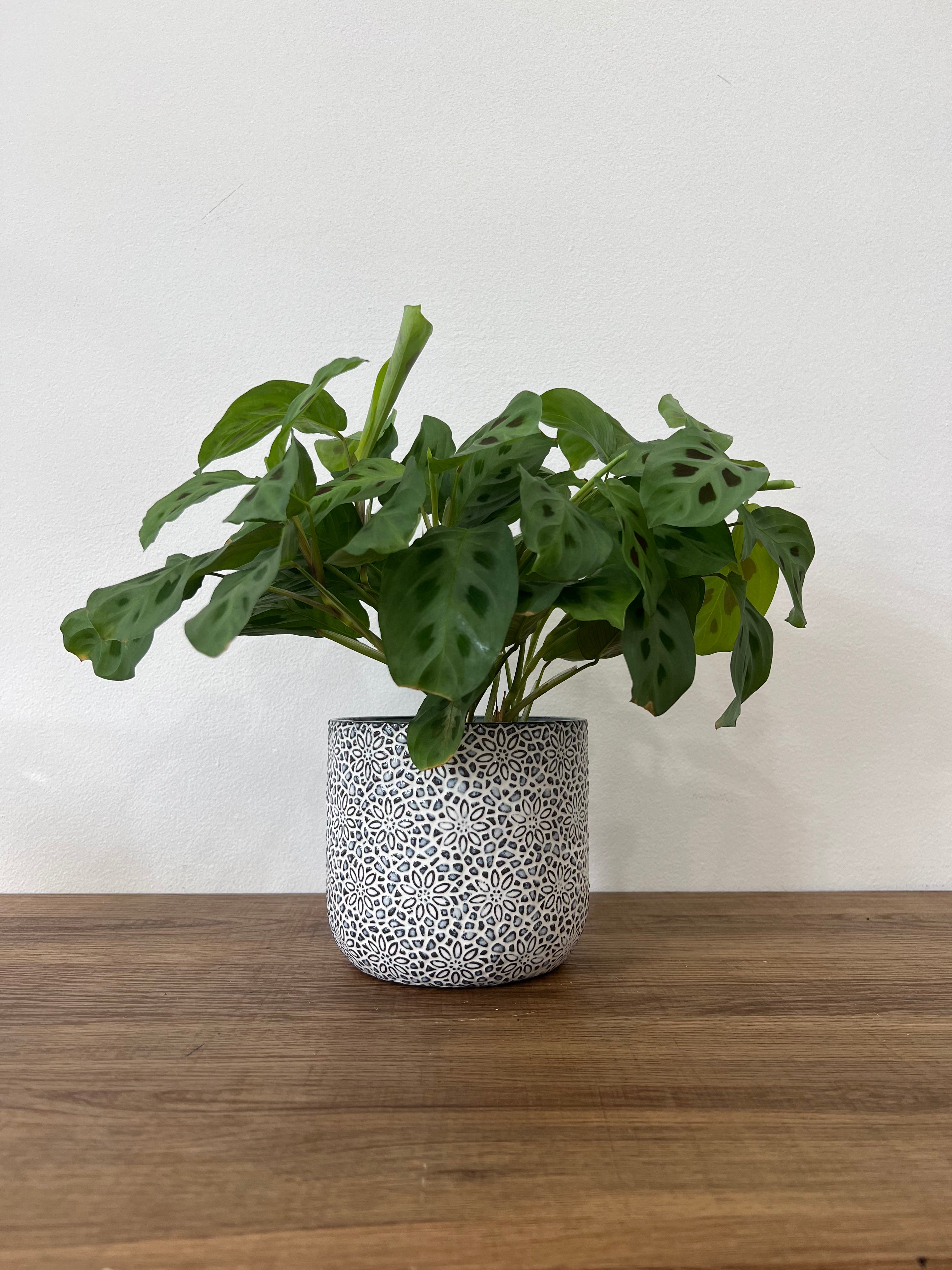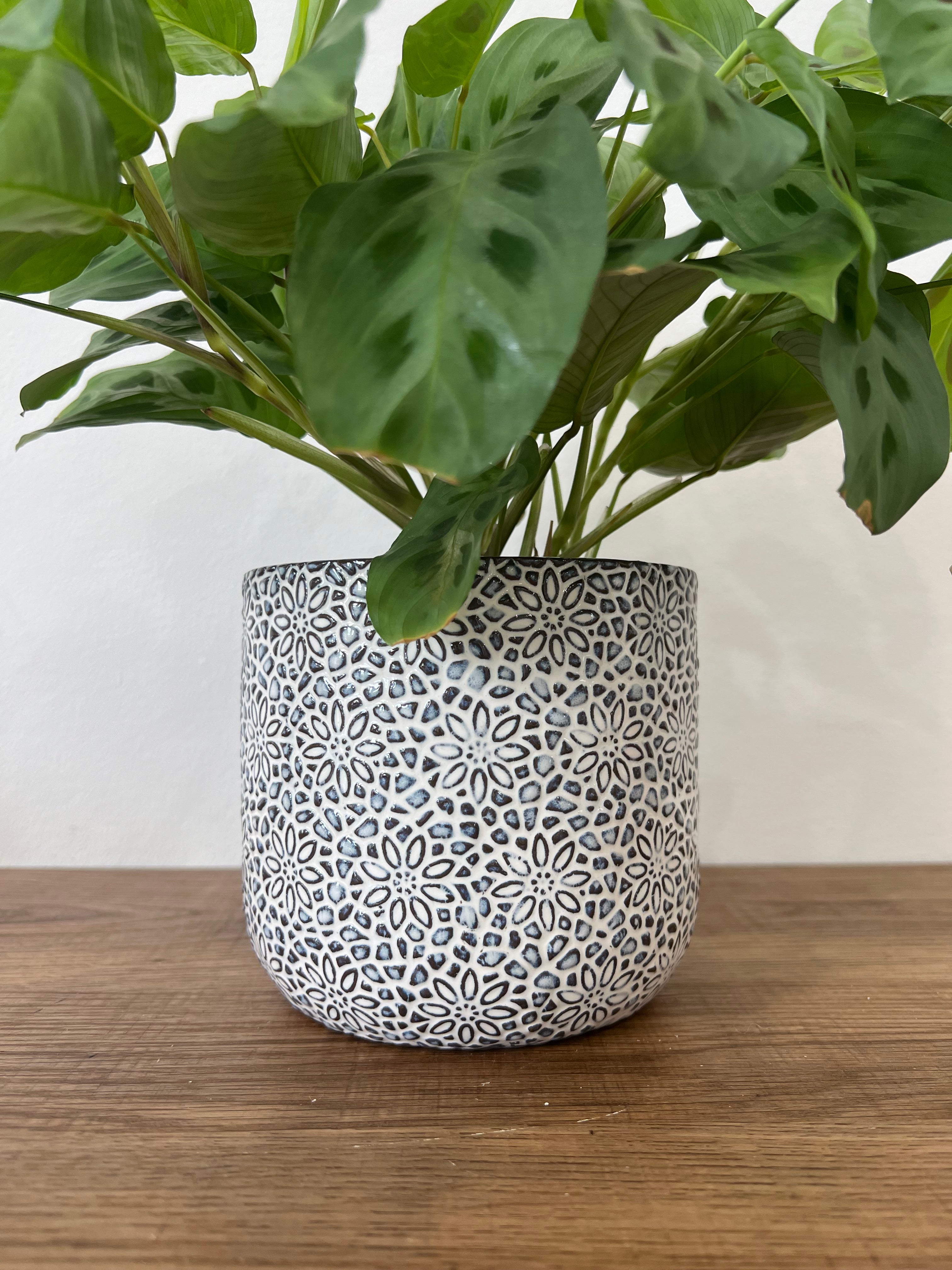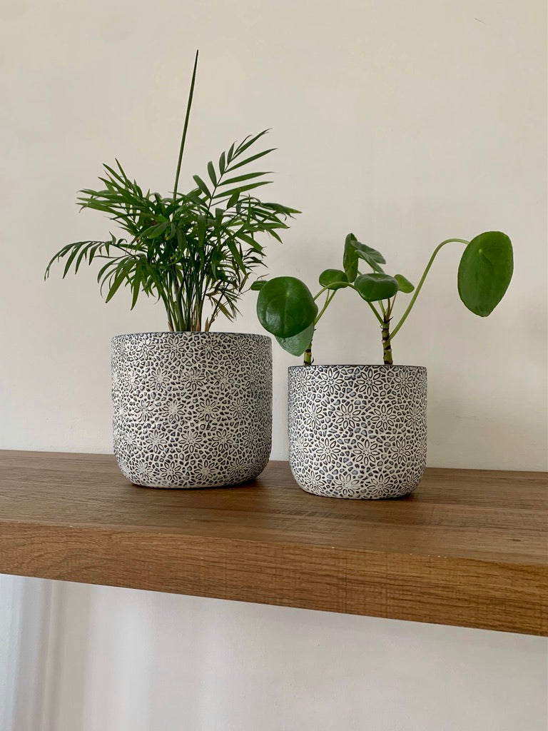 Pebbled navy flowers on white ceramic. This textured look makes these pots the perfect addition to any cool-toned space.